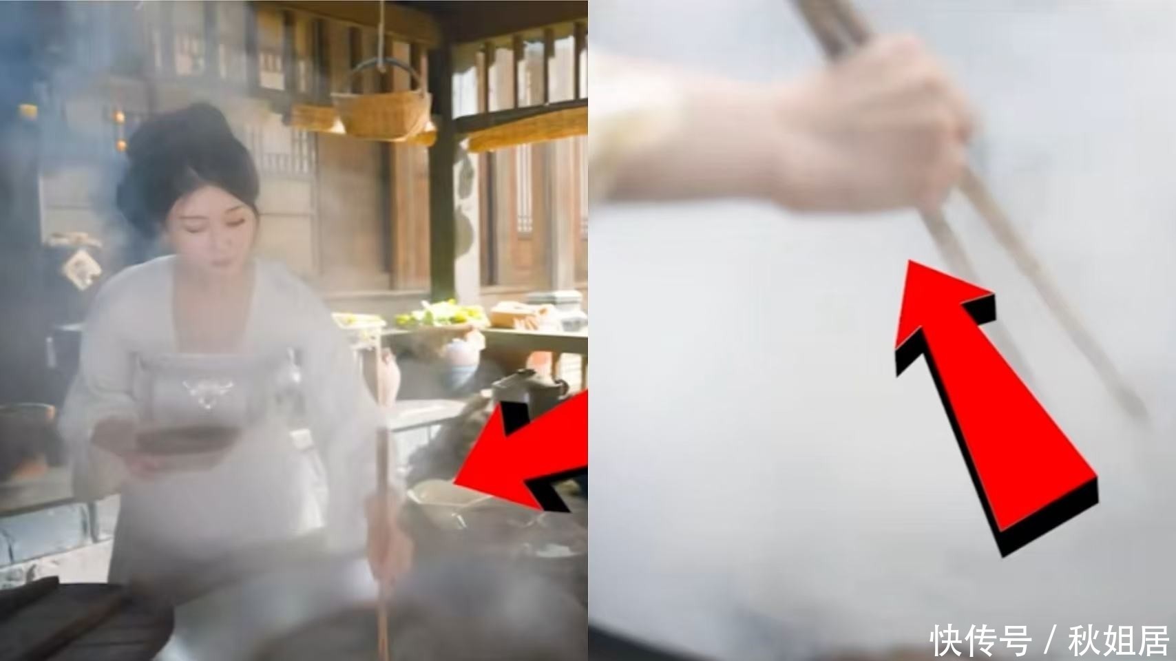 前一秒她左手执筷娴熟翻炒,下一秒特写镜头里右手持勺,指节走向与肌理纹路明显不符。
