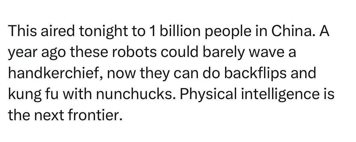 有人表示,仅仅一年时间,机器人便从只会完成基础动作,升级到能表演特技、演绎功夫,这绝非简单进步,而是全球科技力量的惊人跨越。