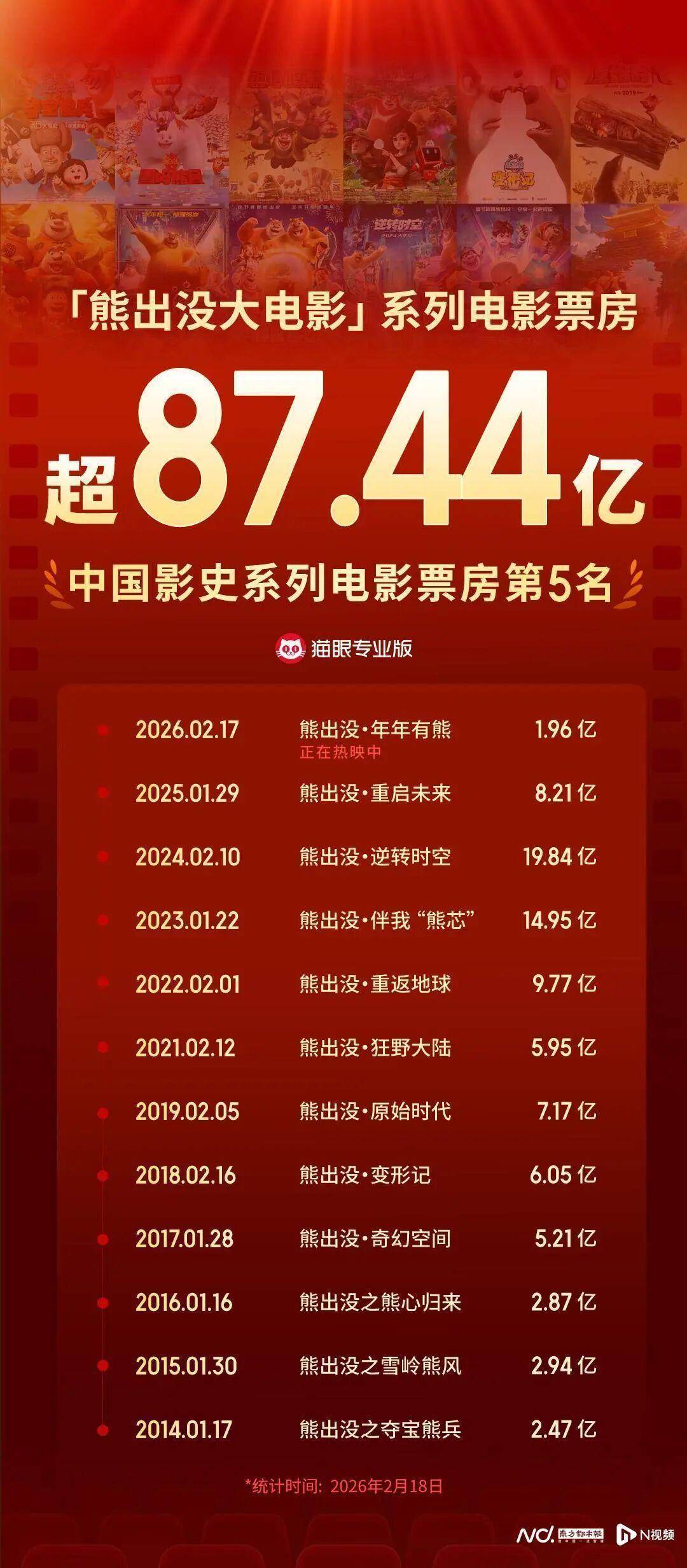 据猫眼专业版数据,截至2月18日0时,《熊出没·年年有熊》累计票房破1.96亿元,助熊出没系列电影总票房超流浪地球系列电影成绩,进入中国影史系列电影票房榜前五。