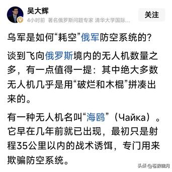 军事专家吴大辉说:这是乌军战略,用大量廉价无人机吸引俄防空系统,消耗昂贵防空导弹,然后用自杀式无人机突防,攻击俄重要军事后勤目标!